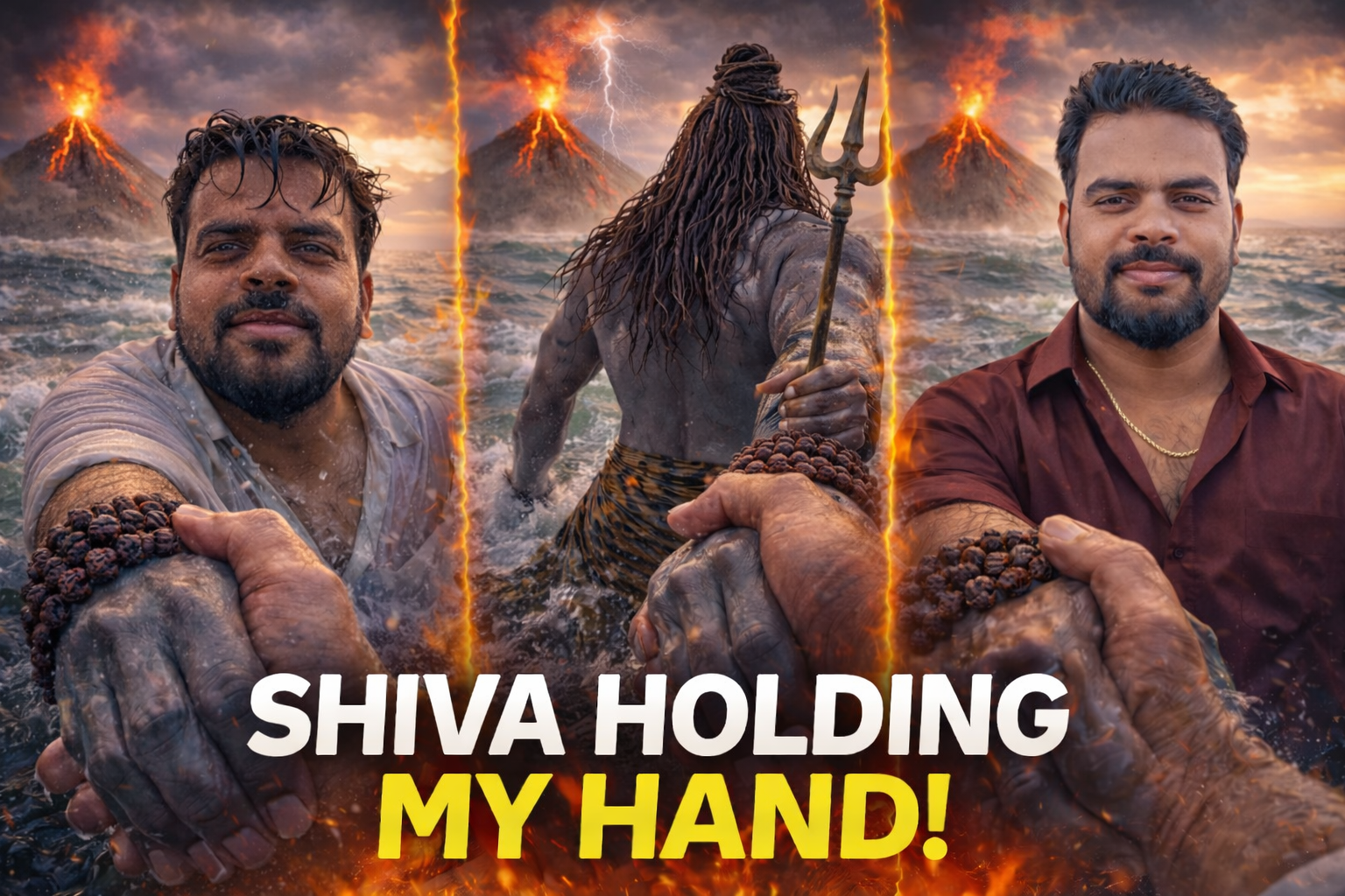 Create an ultra-realistic, hyper-detailed cinematic scene in vertical 9:16 ratio. First-person(in reference image)POV perspective. In the foreground, a powerful divine masculine hand of Lord Shiva is tightly holding my hand, as if he is guiding me(reference image)forward through rough ocean water. Lord Shiva’s hand should look strong, broad, muscular, with visible veins, wet skin texture, realistic pores, water droplets dripping, and natural wrinkles.Skin tone: Natural ash-blue tone (muted greyish blue, not bright neon). He is wearing multiple dark brown rudraksha bead bracelets around his wrist. The beads are detailed, sacred, slightly wet, and highly realistic. The camera angle shows that I am standing waist-deep in turbulent ocean water. I am facing forward toward the viewer (reference image)Don’t change my face structure. My hair is wet, slightly messy, stuck to my forehead due to rain and seawater. Water droplets are visible on my face, beard (if any), neck, and collarbone. I am wearing a white shirt completely soaked with water. The fabric is thin due to wetness, slightly transparent, clinging to my body naturally. My inner chest shape is subtly visible through the wet shirt in a realistic and tasteful way (not exaggerated). The shirt shows detailed wet fabric texture, folds, transparency variation, and water dripping from sleeves. The ocean is stormy and dramatic β€” strong waves crashing, splashes frozen mid-motion, cinematic lighting reflecting on water surface. The water surface should have realistic foam, reflections, depth, and motion blur. In the far background, distant land is visible at the edge of the ocean, slightly foggy and atmospheric β€” as if I walked from that land into the middle of the sea. The land appears small and far away, with subtle mist for depth. Behind everything, a dramatic volcanic mountain is erupting. Bright orange lava flows from the peak, with glowing cracks visible on the mountain surface. Lightning strikes the top of the volcano through dark storm clouds. The sky is cinematic with sunset tones blending into dark thunderclouds β€” warm orange near horizon, deep grey and purple storm clouds above. Lighting style: ultra-realistic cinematic lighting, HDR, volumetric fog, high dynamic range, dramatic contrast, no color grading change from reference, natural tones, realistic skin shading